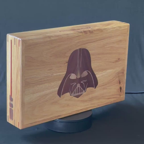 When not in use, it's a piece of art you can display on your shelf. This specific design features the helmet of Darth Vader created out of walnut and mahogany veneers. Along the side are representations of the classic light saber, rendered in mahogany, walnut, and bloodwood for the blade. The box itself is white oak.